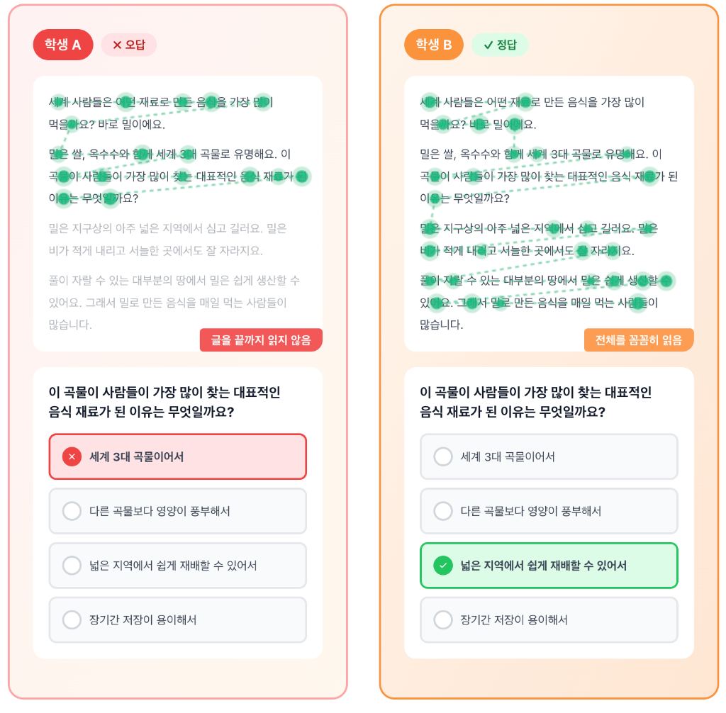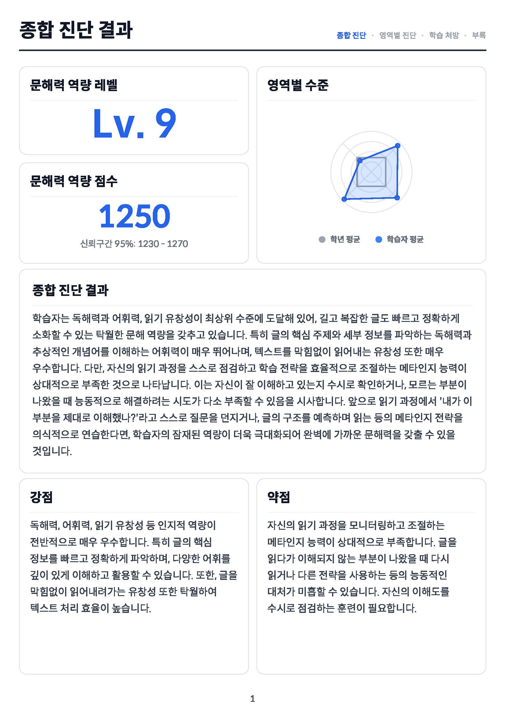 단순 정답 확인을 넘어, 읽기 과정까지 분석하여 문해력 역량을 진단합니다.